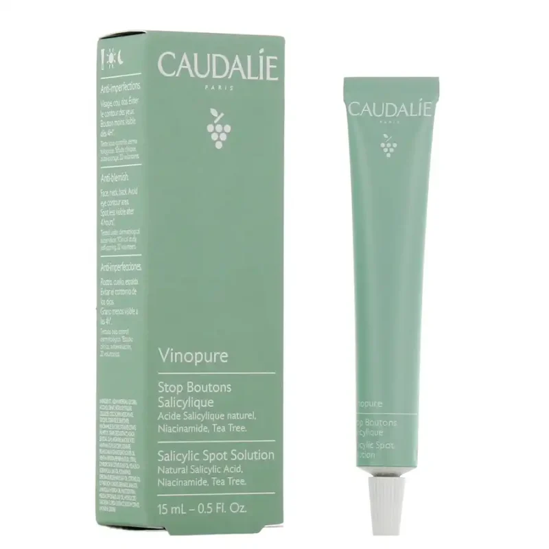 Le Stop Boutons Salicylique Vinopure de Caudalie, en format roll-on tube de 15 ml, est un soin local ciblé pour les peaux à tendance acnéique. Sa formule active associe acide salicylique naturel à 100 %, niacinamide (vitamine B3) et huile essentielle d’arbre à thé pour assainir, assécher et apaiser les imperfections en seulement 4 heures selon un test clinique sur 22 volontaires .
